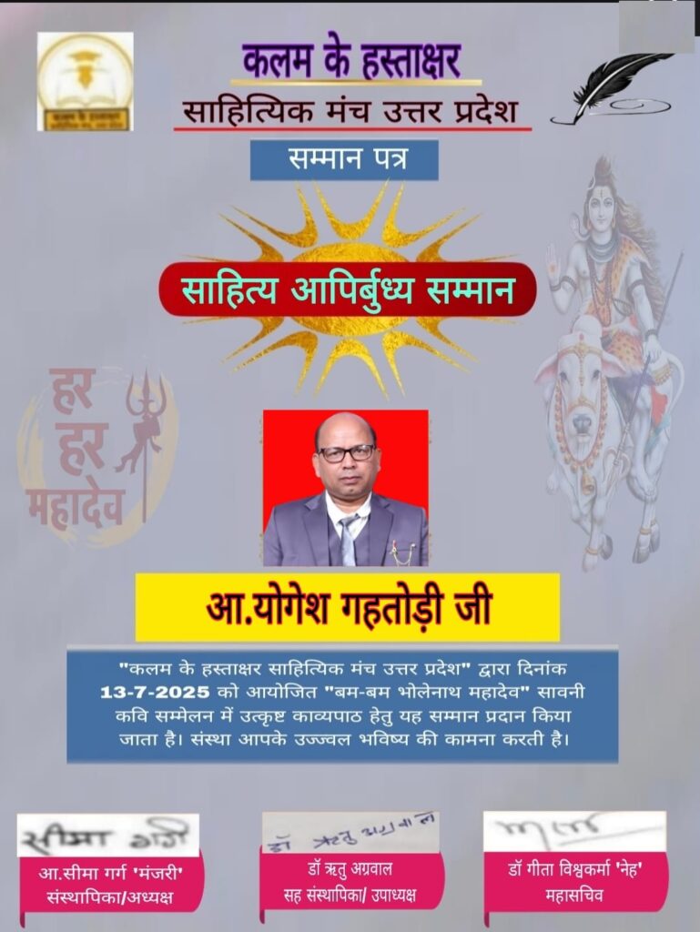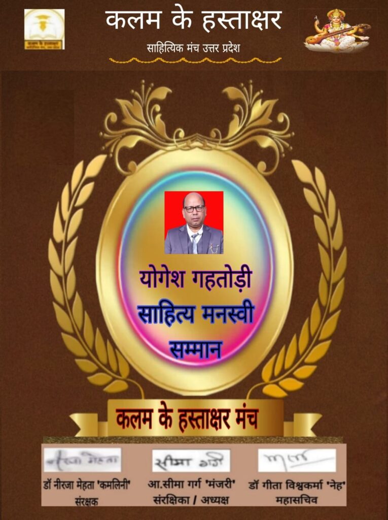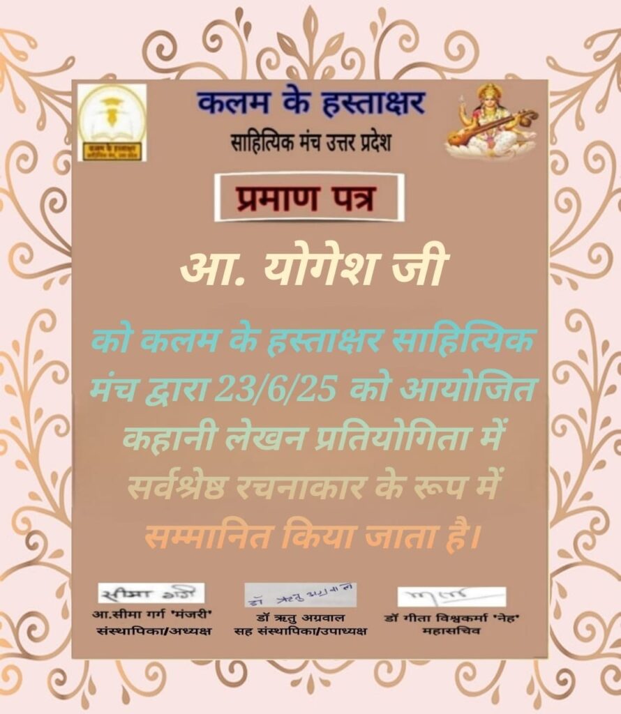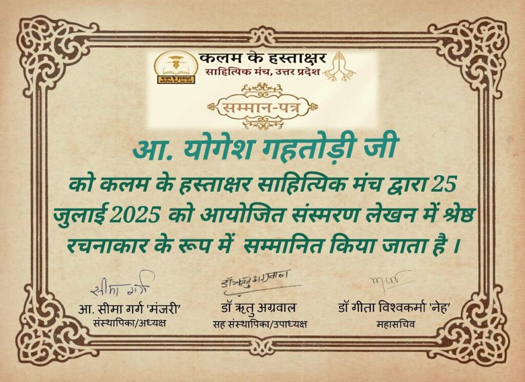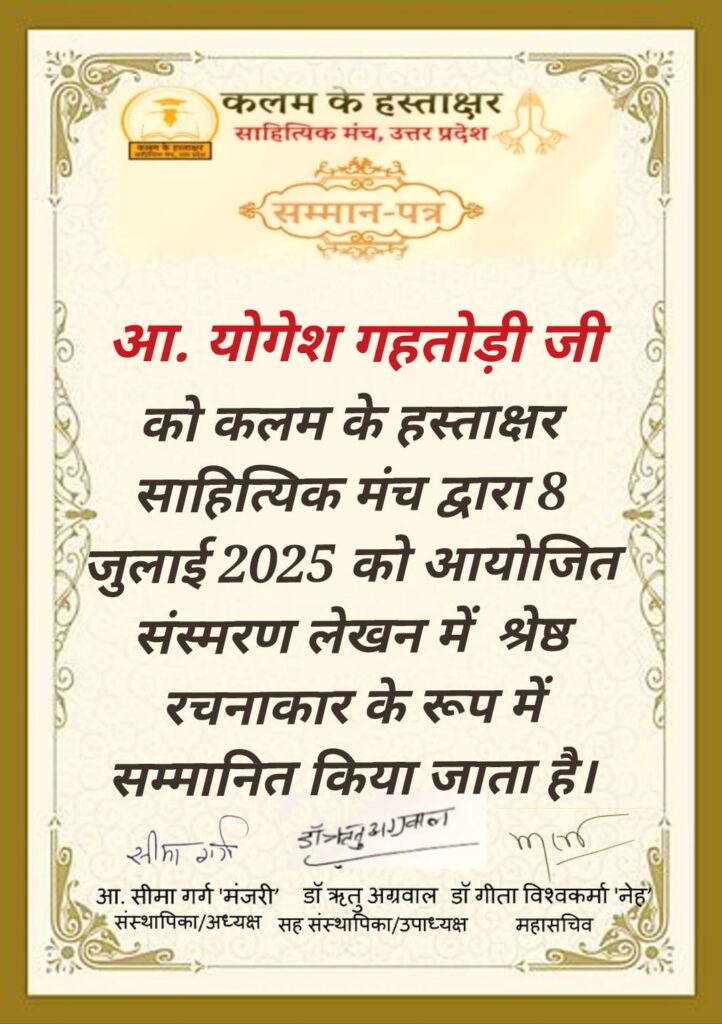 कलम के हस्ताक्षर, मेरठ (उ.प्र.) द्वारा प्राप्त सम्मान पत्र
